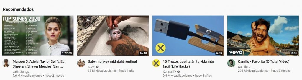 En esta sección YouTube les recomienda a los usuarios videos relacionados con la actividad previa, en ese sentido, es común que, si con anterioridad se estaba interactuando con videos de viajes, es muy probable que el inicio esté repleto de videos populares con este contenido.